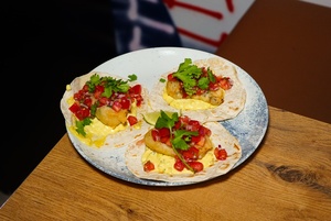 3x placek pszenny/ krewetka w cieście/ nduja/ salsa mango-habanero/ truflowy mayo/ kolendra