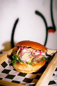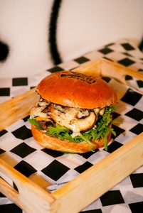 Bułka brioche/ 2x 100g wołowina/ biała cebula/ pieczarki brunatne/ cheddar/ rukola/ majonez truflowy/ marynowana czerwona cebula