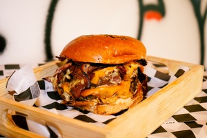 Bułka brioche/ 2x 100g wołowina/ biała cebula/ cheddar/ jalapeno/ sos rosyjki/ szczypiorek/ bekon