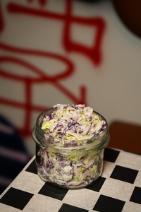 Bułka brioche/ udko z kurczaka/ colesław/ kolendra/ sos kabayaki/ sos chipotle