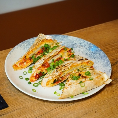 Pszenny placek/ boczniak w panko/ nduja/ mozzarella-cheddar/ salsa mango-chilli/ piklowana czerwona cebula/ szczypiorek