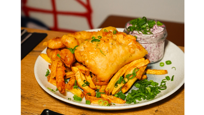 Dorsz w cieście/ domowe frytki/ sos tatarski/ colesław/ szczypiorek