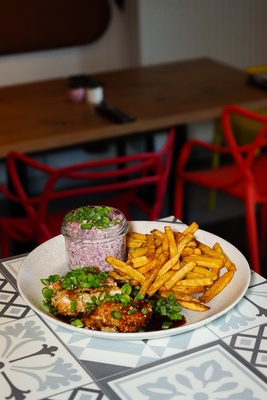Kotlet schabowy w panko/ sos tonkatsu/ domowe frytki/ colesław