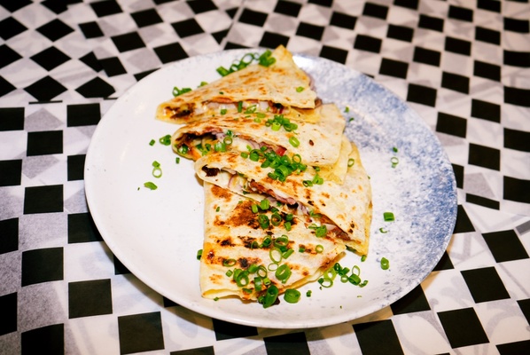 Pszenny placek/ cheddar/ mozzarella/ grillowana pierś z kurczaka/ salsa mango- chilli/ szczypiorek/ pikowana czerwona kapusta