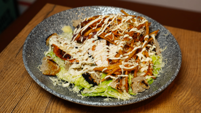 Grillowany kurczak/ sałata rzymska/ bekon/ sos cezar/ sticksy z ziemniaka/ parmezan/ grzanki