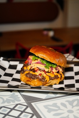 Bułka brioche/ 2x 100g wołowina/ cheddar/ biała cebula/ pico de gallo/ sos habanero/ marynowana czerwona cebula/ kolendra