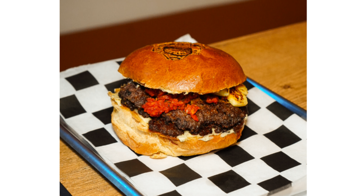 Bułka brioche/ 2x 100g wołowina/ cheddar/ biała cebula/ nduja/ ananas/ truflowe mayo