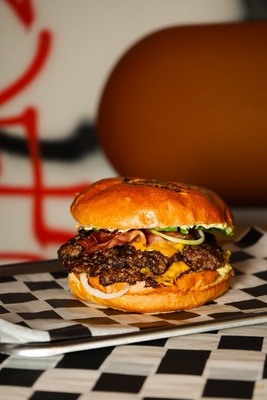 Bułka brioche/ 2x 100g wołowina/ biała cebula/ cheddar/ jalapeno/ sos rosyjki/ szczypiorek/ bekon