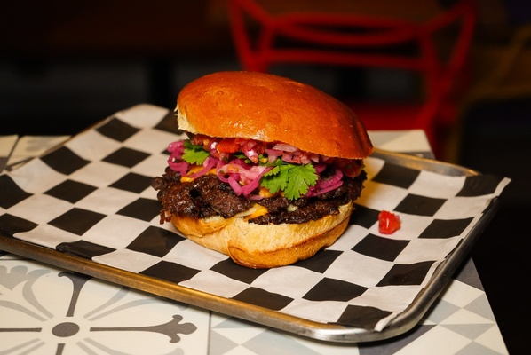 Bułka brioche/ 2x 100g wołowina/ cheddar/ biała cebula/ habanero sos/ jalapeno/ pico de gallo